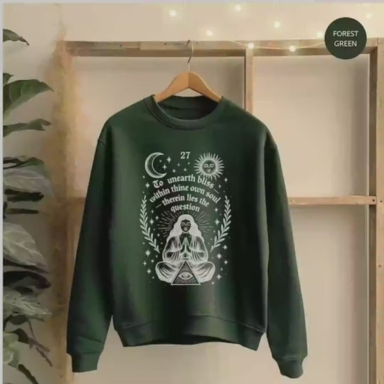 Hülle dich in Komfort und Bedeutung mit diesem poetischen Sweatshirt. Mit einem himmlischen Mond- und Sonnenmotiv, einem inspirierenden Zitat, subtilen esoterischen Texten und zeitloser Gothic-Ästhetik lädt dich dieses kuschelige Soul-Shirt dazu ein, dein Inneres zu entdecken. Ethisch bedruckt auf ultraweichem Fleece, ist es wie geschaffen für alte Seelen, tiefgründige Denker und alle, die einen Hauch von Okkultismus schätzen.