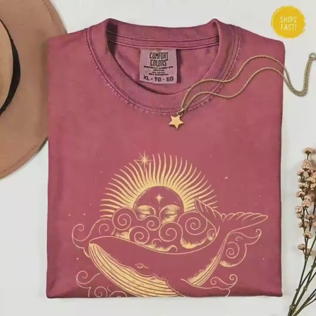 Comfort Colors® Whale Sun Moon Sea stars T-shirt is a beachy and Christian-inspired tee perfect for those who love Jesus and the ocean. This relaxed fit garment-dyed T-shirt gives off a calming and tranquil vibe, making it ideal for beachgoers and Christians. Great for summer days, beach vacations, and casual outings.